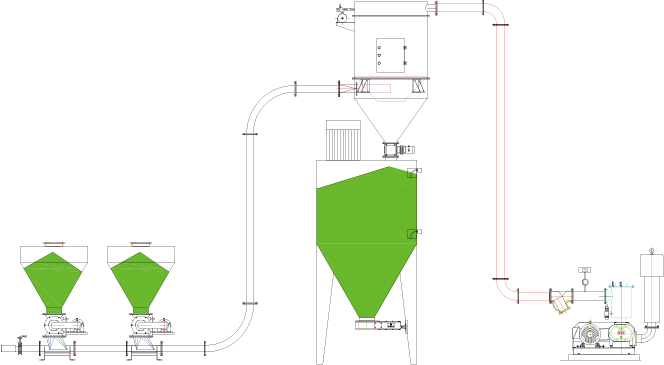 該輸送方式設備簡單,給料形式采用旋轉閥對很細的物料也可以保持氣密而連續卸料,可以在高真空度情況下連續的作高效輸送,通過對輸料管的冷卻,可對高溫粉料作冷卻輸送,適用于從低而狹窄的料斗中將物料卸出。